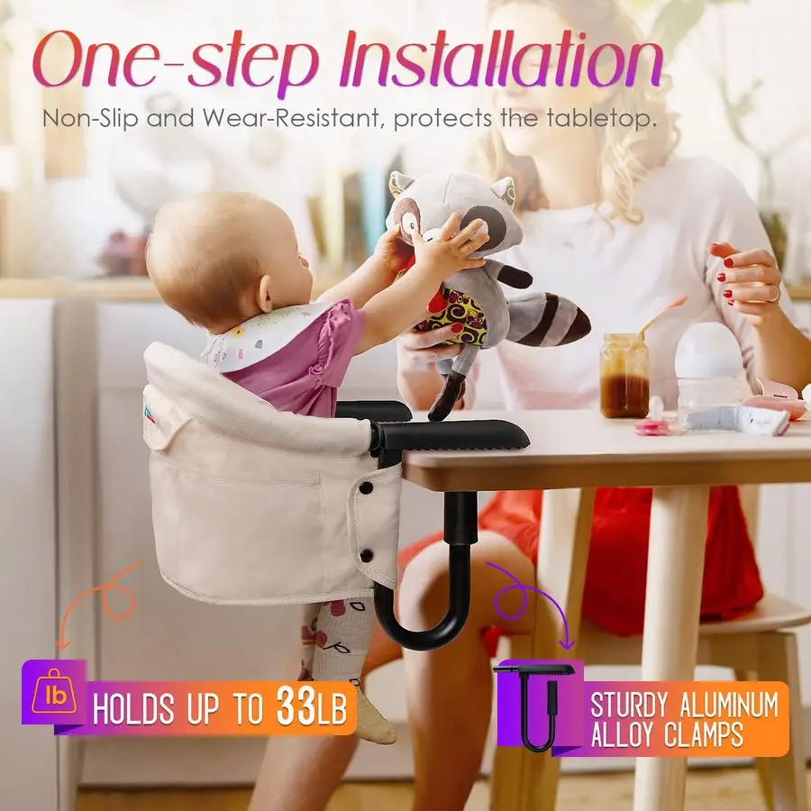 This portable baby high chair features a strong aluminum alloy clamp that supports up to 15 kg (33 lb), making it suitable for infants and toddlers aged 6–36 months. Built for stability and long-term use.