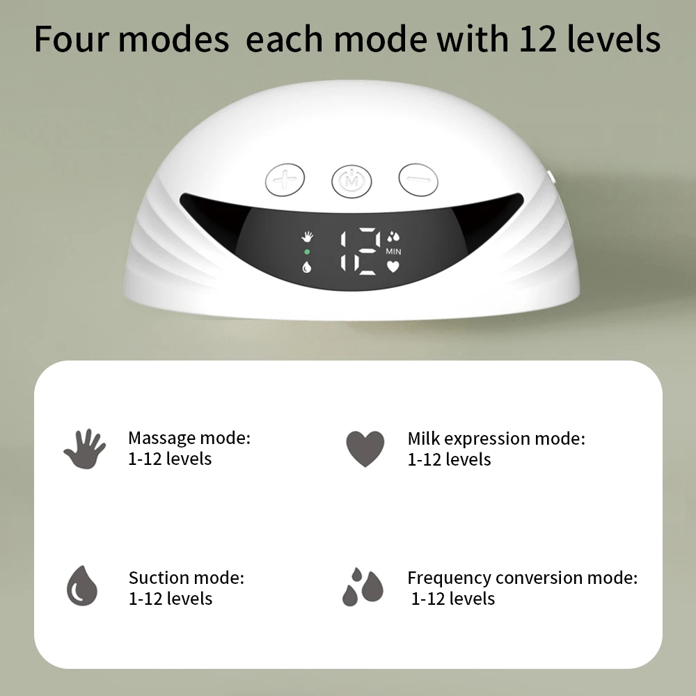Choose from Massage, Expression, Auto, and Lactation modes, each with 12 adjustable intensity levels. Whether you want to stimulate milk flow or express quickly, this pump adapts to your needs for a personalized experience.